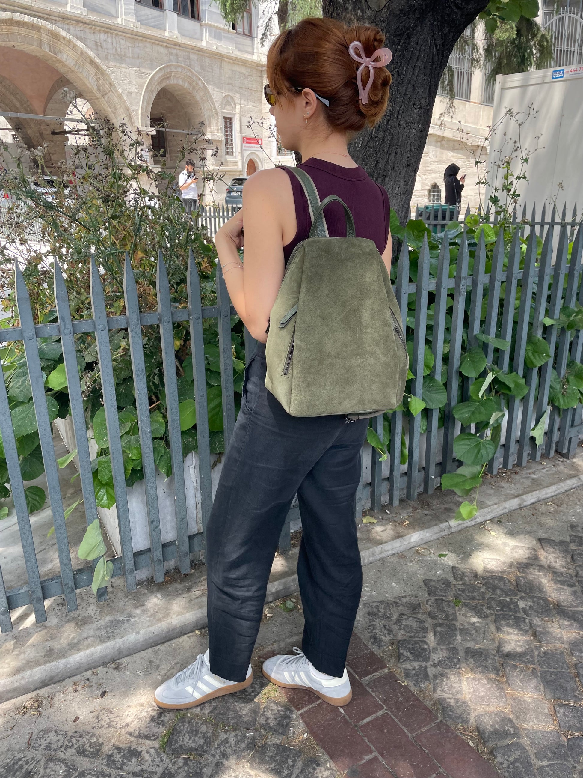 Hakiki süet deriden üretilmiştir, çantanın arka kısmı hakiki deriden üretilmiştir.